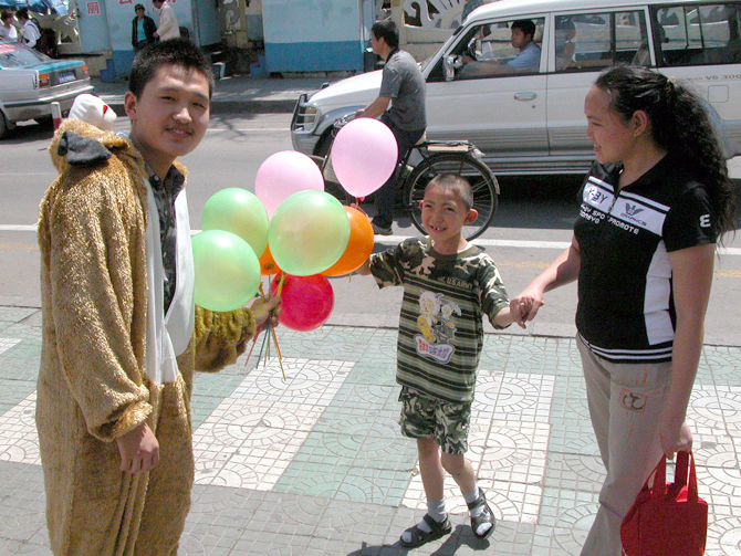 在毛衫城钢结构口部,导购员们穿上卡通服,为过往的小朋友赠送汽球。小小汽球带来了节日的快乐和温馨,孩子快乐,家长高兴。一对路过的孪生小兄弟,收到汽球后,家长高兴地为他们拍下这一瞬间。红博广场的小礼物为节日带来了快乐的气氛。