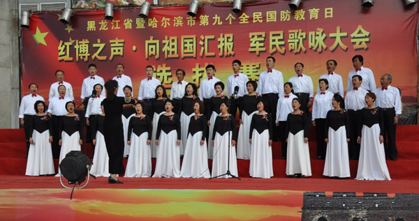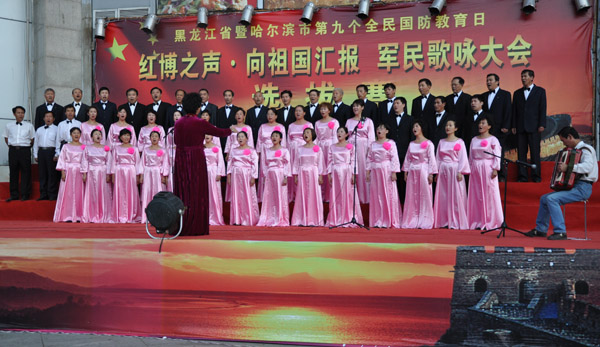 一场大型的军民共同参与,为期十余天以热爱国防、支持国防为内涵、纪念我国第九个全民国防教育日的大型歌咏比赛——“红博之声·向祖国汇报”军民歌咏大会,昨日进行了最后的激烈角逐。13日下午3点整,在红博会展购物广场的正门广场进行了大合唱的最后一场选拔赛。从6日开赛至今,20余支合唱团队参加比赛,每个团队都将自己的特色展现至极。
