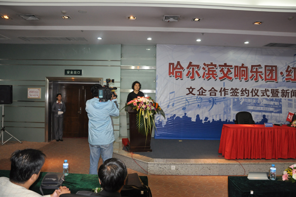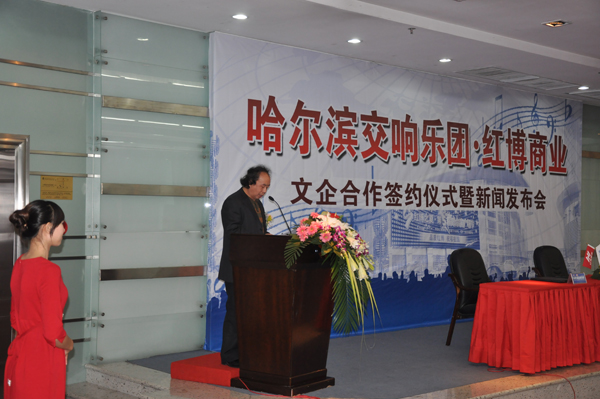 昨日,在哈尔滨国际会展体育中心会议中心,哈尔滨交响乐团与红博商业文企合作签约仪式暨新闻发布会隆重举行,哈尔滨市委宣传部副部长王刚、哈尔滨市文化局局长杨晓平、哈尔滨市歌剧院院长陈晓生、黑龙江省服装协会会长、红博商业总经理王丽梅等出席本次会议,并在会上讲话。会议由哈尔滨市文化局副局长主持。