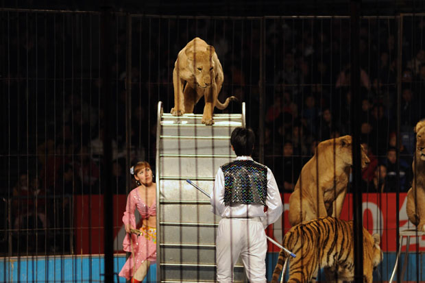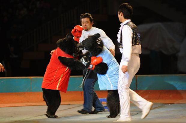 当日下午,孩子们整洁一新,高兴得象过年一样早早就来到体育馆,他们或相互议论着,或不停地询问家长,“我们能看到大老虎吗?”、“大马戏表演什么样儿啊?”马戏表演开始了,孩子们屏气凝神,盯住舞台。两只狗熊跑上来,磨拳擦掌,“世纪拳王争霸赛”在孩子们的笑声中开始了。红衣蓝衣两只狗熊顿时扭打在一起,第一第二回合,双方各有胜负。见势均力敌,求胜心切的蓝衣熊来个突然袭击,冲向红衣熊,猝不及防的红衣熊被一拳打倒在地。蓝衣熊还想乘胜追击,不幸裁判向它出示黄牌,最终红衣熊获胜。狗熊拳击赛、小狗算算术、狮子钻火圈、老虎跳山间……动物们精湛的表演赢得了孩子们阵阵撑声。