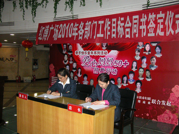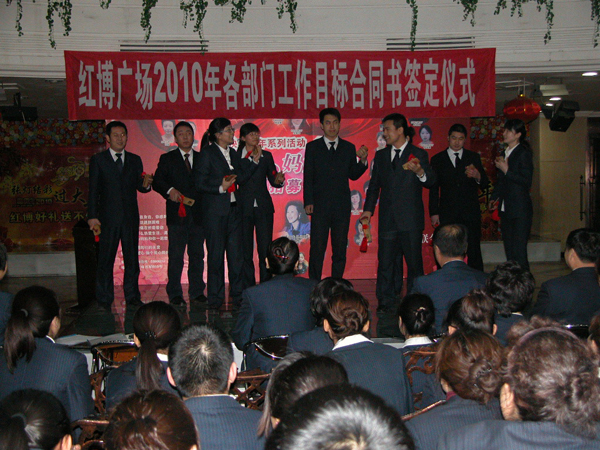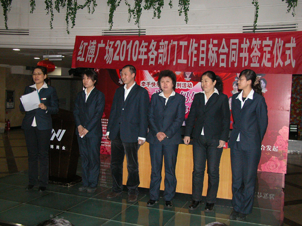 2月5日18时,红博广场全体员工在阳光大厅参加了2010年工作目标合同书签订仪式大会。在与各部门签订工作目标合同书之前,张丽娟副总经理对红博广场2009年工作进行了全面总结,并向员工们介绍了2010年主要经营指标和工作计划内容。