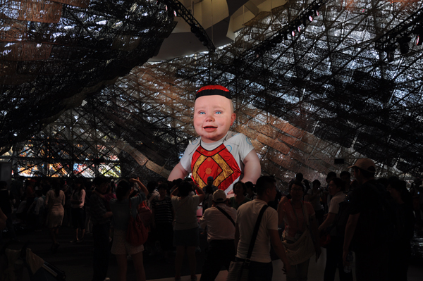 在游览的人群中,红色的帽子、红色的T恤,一袭时尚装束的红博团队成为世博园的一道靓丽风景线。