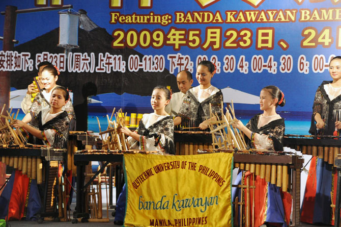 班达竹乐团是菲律宾一支著名的乐队,曾到过世界许多国家演出,也来过中国多次。乐团全部以竹制打击乐和管乐为主,节奏清新明快,旋律自然动听。音乐风格集西班牙、印度、非洲、南亚为一体,结合菲律宾本土音乐特色,深情自然、热烈奔放,带有浓郁的热带风情。多部木琴马林巴和各种竹自乐器觥筹交错,奏响一曲曲海岛沙滩畔的天籁之声。带有异国韵味的《月亮代表我的心》,深切表达了菲律宾人民热情友好的心声。演出即将结束,班达竹乐团的俊男美女与幸运观众现场共舞,让观众在红博就感受到椰子之国的浪漫情调。