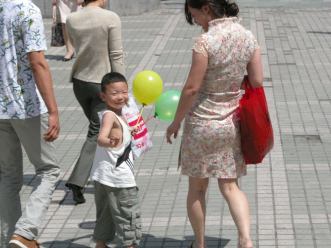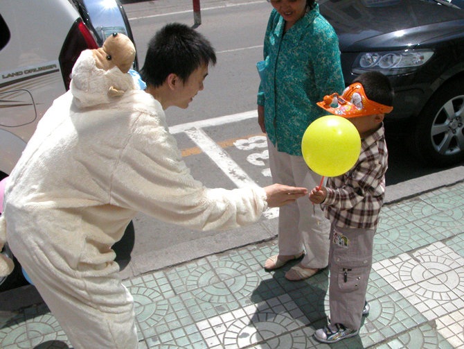 在毛衫城钢结构口部,导购员们穿上卡通服,为过往的小朋友赠送汽球。小小汽球带来了节日的快乐和温馨,孩子快乐,家长高兴。一对路过的孪生小兄弟,收到汽球后,家长高兴地为他们拍下这一瞬间。红博广场的小礼物为节日带来了快乐的气氛。