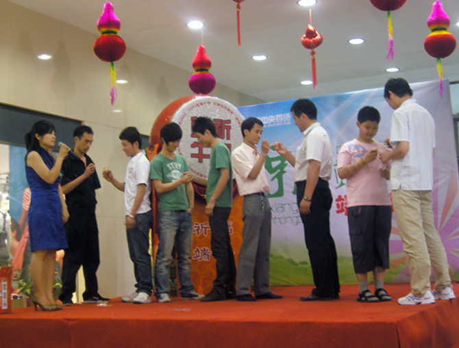 红博中央百货与市民同庆端午,在一层中厅摆设了祈福大鼓和祈福树,来店里购物的顾客可以得到一张精美的祈福卡片写上他们对家人朋友的祝福。仅仅一个下午,两棵祈福树就挂满了心愿卡片。工作人员免费发放印有红博中央百货和红乐汇字样的充气棒,深得顾客的喜爱,工作人员不停地人工吹气仍供不应求,一时间整个中央百货里都是举着充气棒敲打嬉戏的情侣、老人和孩子。