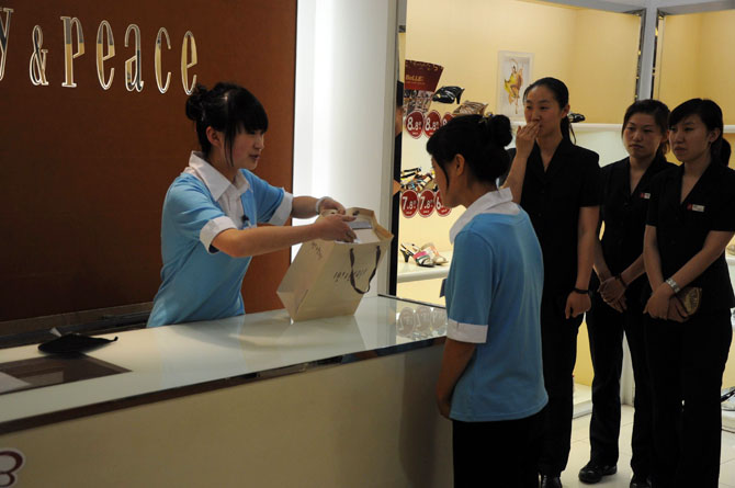 商场区域经理在为导购员示范CS顾客接待服务礼仪