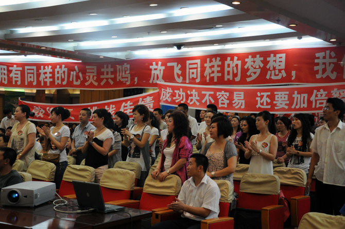 最后,王总充分肯定了6月25日红博商业开展的“凝聚团队 迈向巅峰”户外登山活动,对服装经纪人们在登山过程中表现出的顽强精神给予了表扬。为进一步弘扬红博迎难而上、不断进取的企业精神,王丽梅总经理和两位专家顾问向各科服装经纪人代表们颁发了“挑战自我战胜奖”纪念牌。