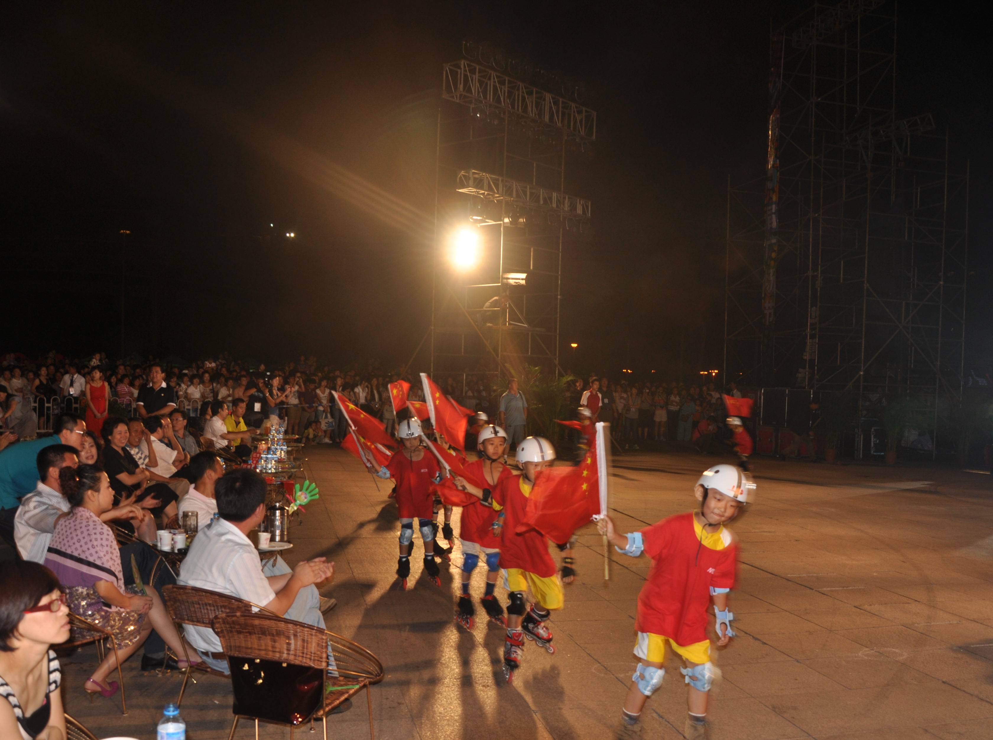 在开幕式现场,一群戴着头盔、护膝,手中拿着鲜艳的国旗的轮滑少年受到很多人的关注,当记者问他们要表演什么节目时,这些孩子一个个含笑不语,花园小学3年级的学生刘桢笑着对记者说:“一会表演出来你就知道了。”当《祝福祖国》的音乐声响起时,这群孩子挥舞着手中的国旗,绕着主会场向观众们致意。很多人都被这个场面而感染,欢呼声和掌声此起彼伏。当歌声快要结束的时候,孩子们有的首尾相连,有的高举国旗,组成了一个“60”的字样。现场的气氛一下子就被推向了高潮。