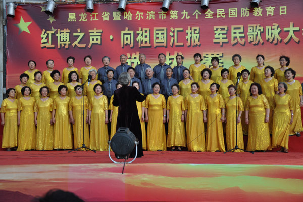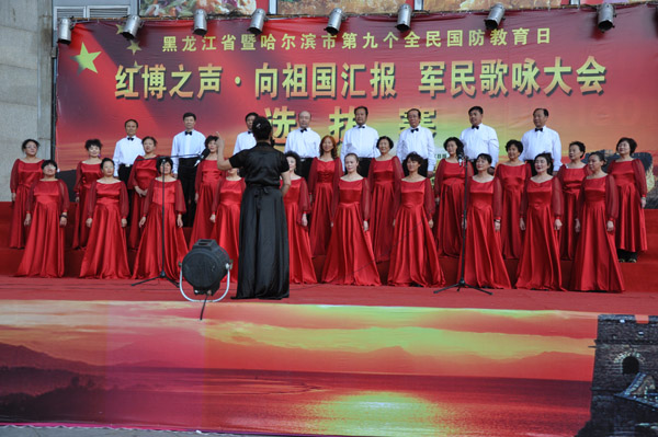 一场大型的军民共同参与,为期十余天以热爱国防、支持国防为内涵、纪念我国第九个全民国防教育日的大型歌咏比赛——“红博之声·向祖国汇报”军民歌咏大会,昨日进行了最后的激烈角逐。13日下午3点整,在红博会展购物广场的正门广场进行了大合唱的最后一场选拔赛。从6日开赛至今,20余支合唱团队参加比赛,每个团队都将自己的特色展现至极。