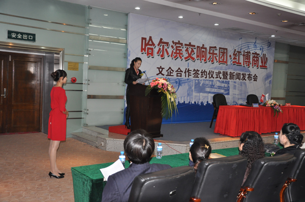 昨日,在哈尔滨国际会展体育中心会议中心,哈尔滨交响乐团与红博商业文企合作签约仪式暨新闻发布会隆重举行,哈尔滨市委宣传部副部长王刚、哈尔滨市文化局局长杨晓平、哈尔滨市歌剧院院长陈晓生、黑龙江省服装协会会长、红博商业总经理王丽梅等出席本次会议,并在会上讲话。会议由哈尔滨市文化局副局长主持。
