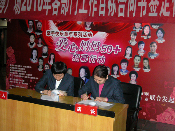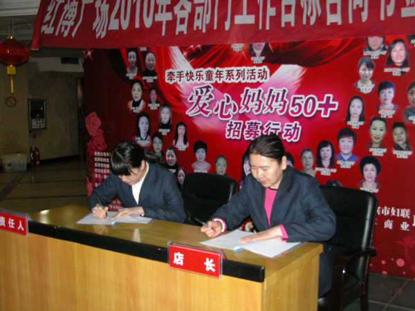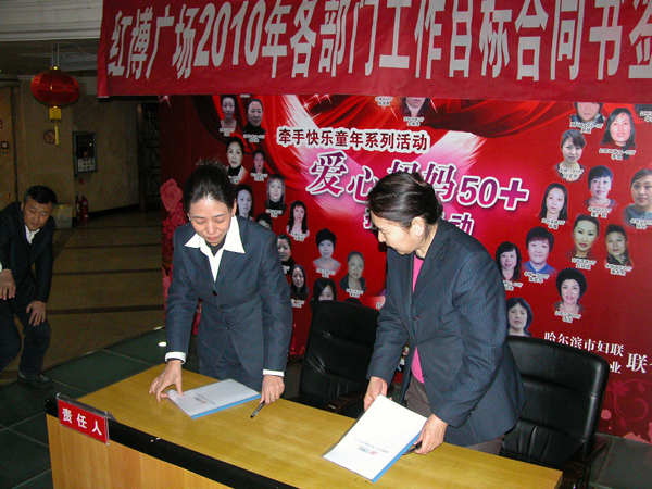 2月5日18时,红博广场全体员工在阳光大厅参加了2010年工作目标合同书签订仪式大会。在与各部门签订工作目标合同书之前,张丽娟副总经理对红博广场2009年工作进行了全面总结,并向员工们介绍了2010年主要经营指标和工作计划内容。