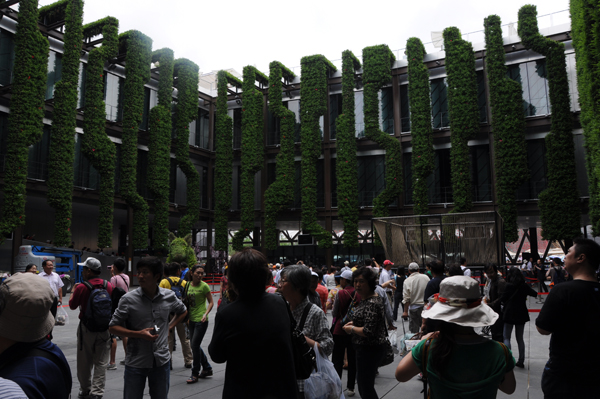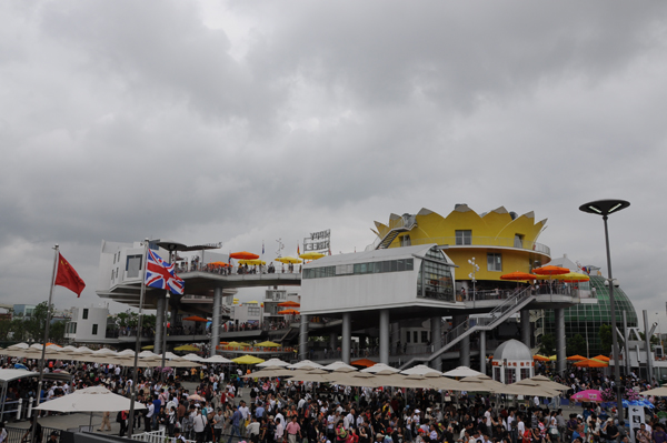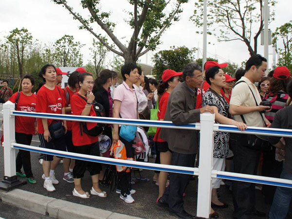 在游览的人群中,红色的帽子、红色的T恤,一袭时尚装束的红博团队成为世博园的一道靓丽风景线。