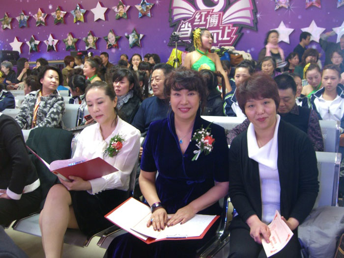 五位女企业家寄语春蕾女童,诗朗诵《手拉手,我们走向春天》。左起:秋林食品、三五味业、女王美容、大发国际、红博商业
