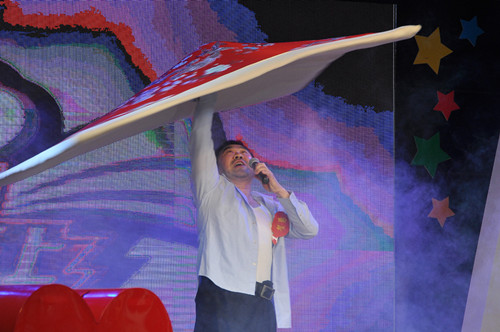 贺勇今年50岁家住哈市道里区,在舞台上旋转着巨大的被子高声歌唱。