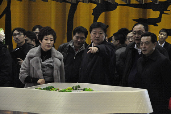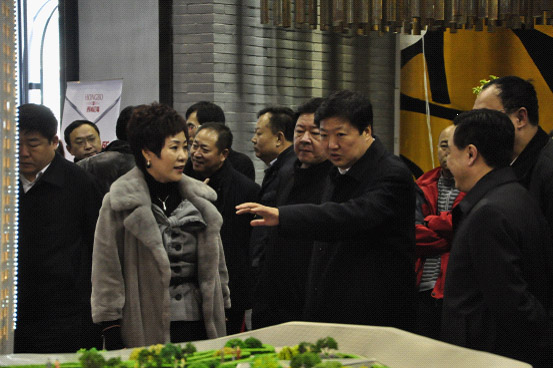 宋希斌市长(左四)在王丽梅总经理的陪同下,参观了西城红场售楼大厅。