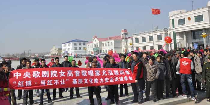 4月13日,“红博·当红不让”第一笔基层文化助力资金行动走进呼兰康金镇,捐助该镇的文化站2万元,该镇是全国先进基层文化站,不仅拥有深厚的群众文化基础,持续开展文化活动的土壤,而且培养了众多文化骨干和人才。中央歌剧院女高音歌唱家,曾经在人民大会堂与世界三大男高音之一卡雷拉斯同台的尤泓斐,就是从康金镇走出来的。当她听说“红博·当红不让”基层文化助力资金行动走进康金的时候,她非常感动,带着浓浓的乡情思念,参与到此次活动中,与“红博·当红不让”栏目组一同回到了家乡,并向家乡的文化站捐助1万元。她在现场面对众多乡亲,饱含深情演唱完《父老乡亲》后,告诉记者:“红博·当红不让”是一个非常好百姓的平台,是实现梦想的舞台,有了“基层文化助力资金”,家乡的文化事业将得到更大的发展,我要关注家乡文化事业的发展,为家乡文化事业的发展做出自己的贡献。