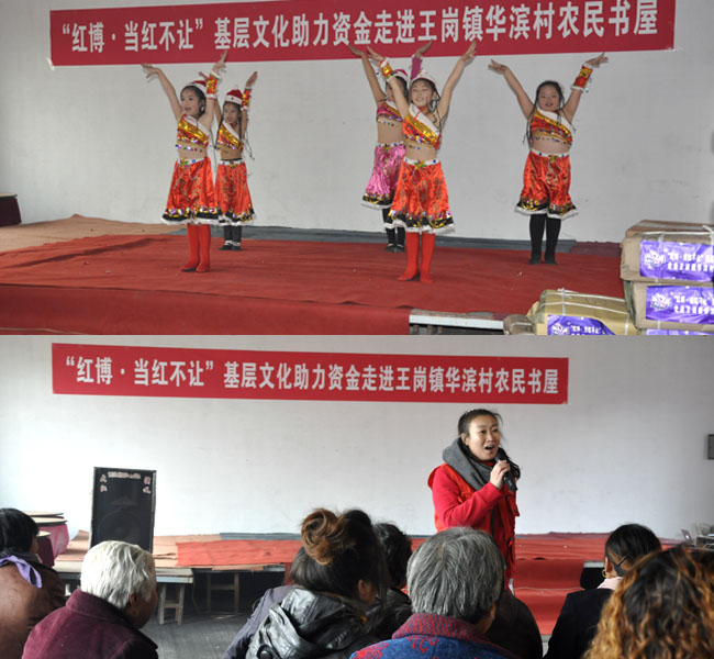 10月30日,大型百姓互动娱乐节目红博·当红不让基层文化助力活动走进了王岗镇华滨村农家书屋,这是继助力康金文化站、走进哈工程大学、慰问“最美女教师”张丽莉后的第四次助力活动,此次,“当红”栏目组为农家书屋带来了农业图书、科普知识、经济、人文、儿童等各种图书及电脑等,总价值达2万元。同时,“当红”达人还带来了丰富多彩的歌舞表演,给华滨村村民们带来了一场文化视觉盛宴,受到了业界人士、社会名人及市民们的一致认同。
