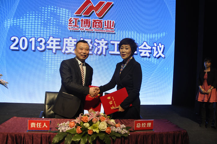 会议最后,王总与各分店、中心分别签订2013年度工作目标合同书,工作目标合同书不是单纯的经济和工作指标的分解,更是每一位红博人对于自己工作的承诺和誓言!会议在与会人员久久不息的掌声中结束。2012年红博满载收获,王总当选为全国人大代表,这是全体红博人的骄傲,也是所有龙江商业企业的骄傲。